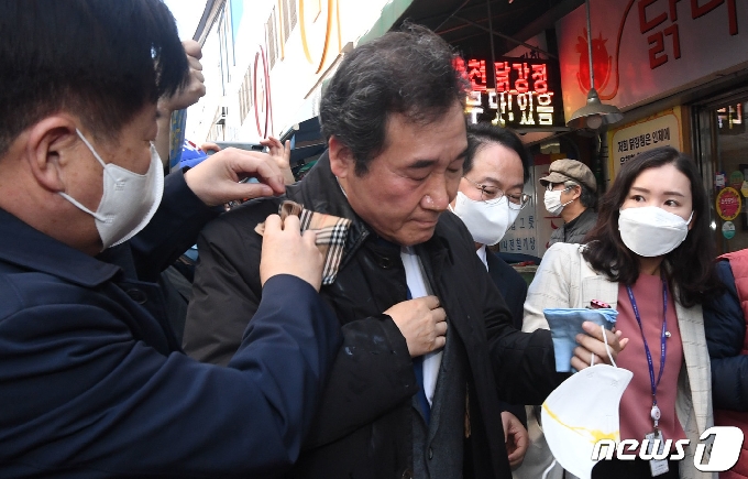 이낙연 더불어민주당 대표가 5일 민생탐방행사로 방문한 강원 춘천시 중앙시장에서 기습적으로 반대 시민단체 회원이 던진 계란을 맞는 테러를 당했다.